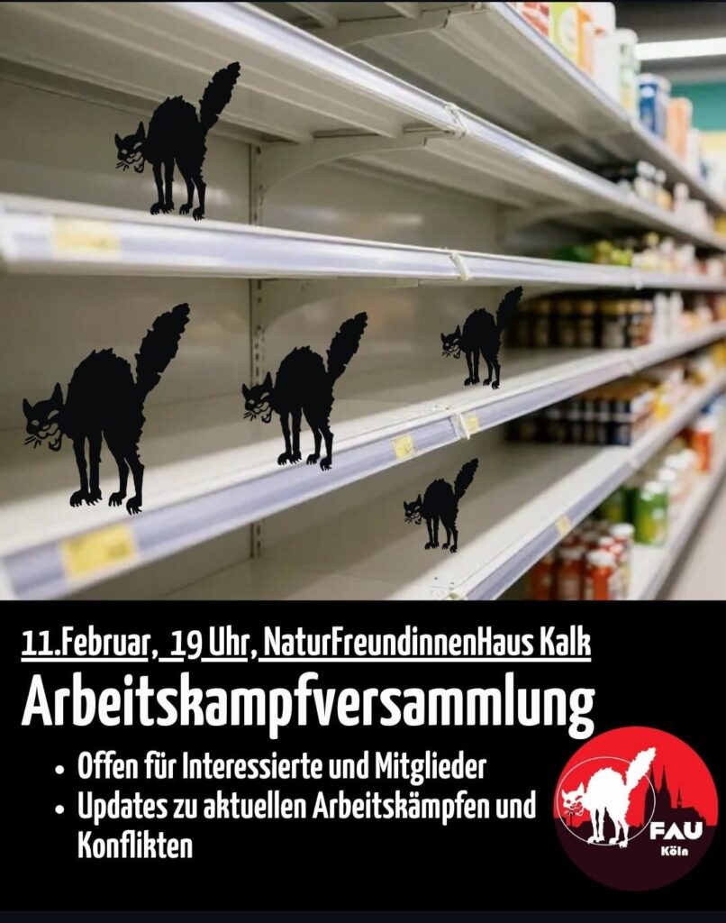 Am Mittwoch, dem 11. Februar um 19 Uhr findet unsere nächste Arbeitskampfversammlung (AKV) statt – wie immer jeden zweiten Mittwoch im Monat im Naturfreundehaus Kalk, Kapellenstr. 9A, 51103 Köln. Wir sprechen über unsere Erfahrungen im Job, aktuelle Arbeitskämpfe, tauschen uns aus und vernetzen uns. Komm vorbei – und bring deine Kolleg:innen mit!